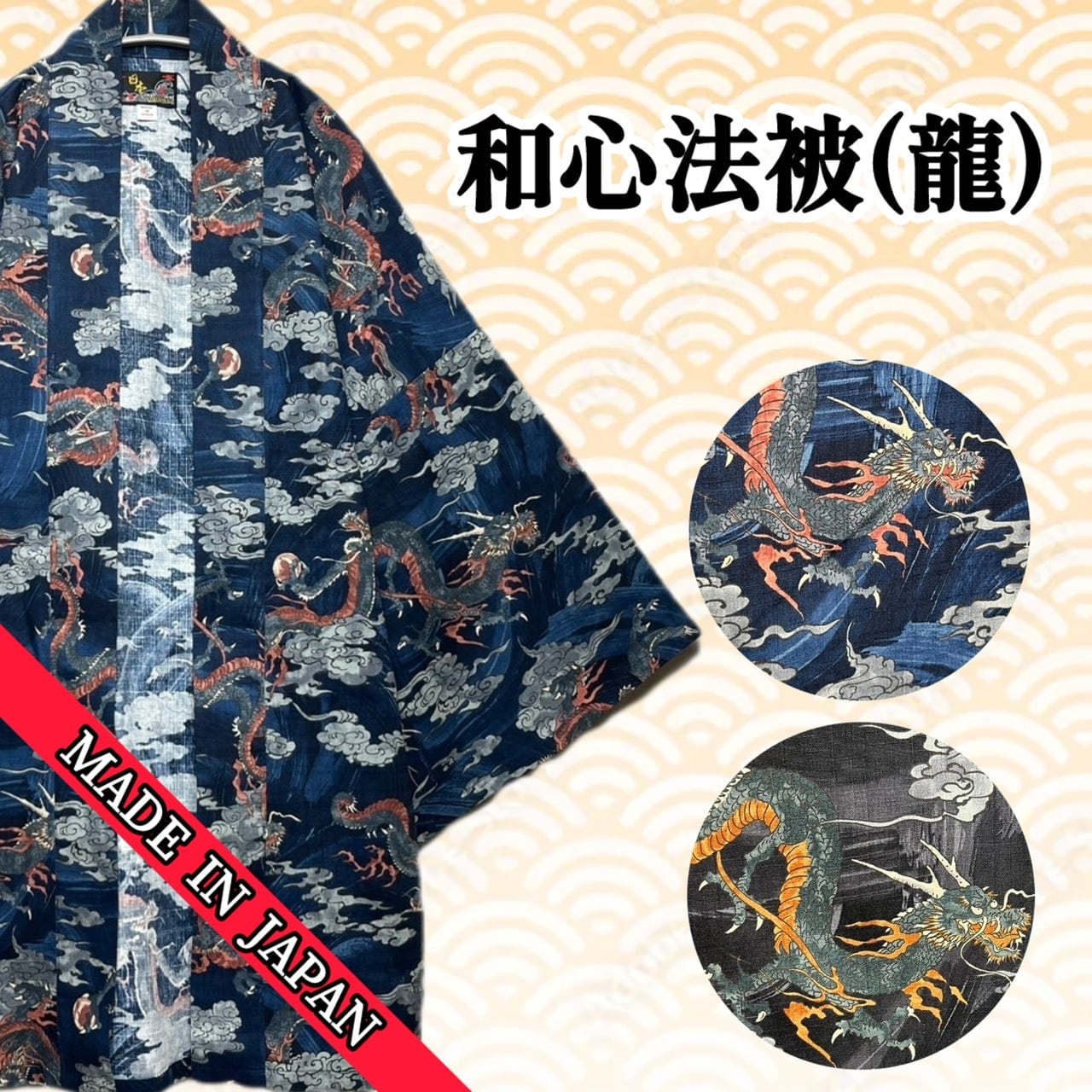 "和心法被(はっぴ) 龍 日本製 CIAO TOKYO 539-09"は、目を引く龍のデザインが全体に施されたインパクトのある法被です。この特別な一着は、あなたのスタイルに力強さを加え、日常をより魅力的に彩ります。