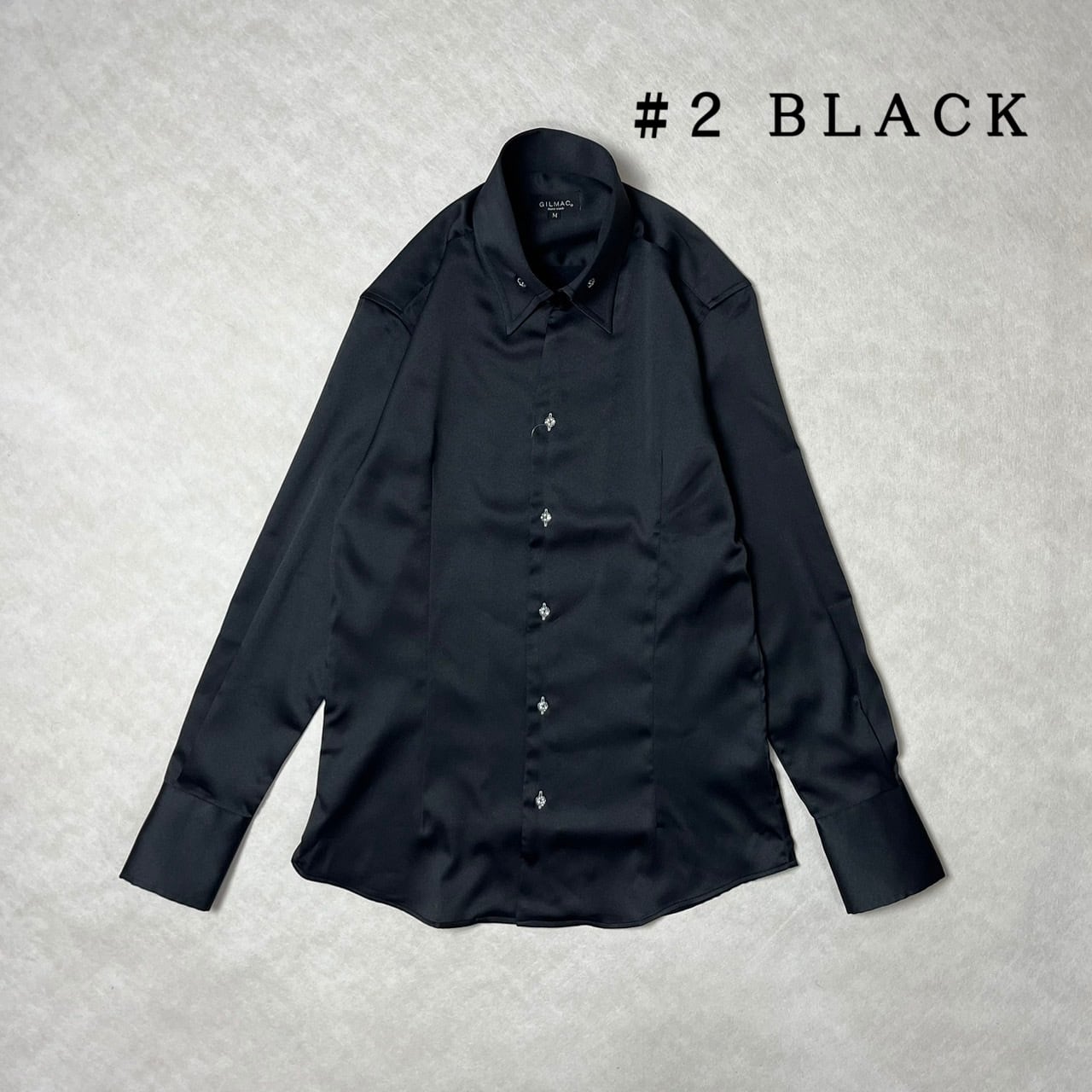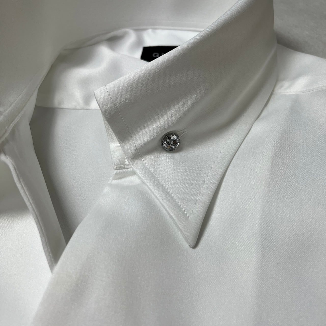 上品な光沢と滑らかな肌触りが魅力のパウダーサテン素材を使用した、シンプルながらも洗練されたワンピースカラーのBDシャツ。