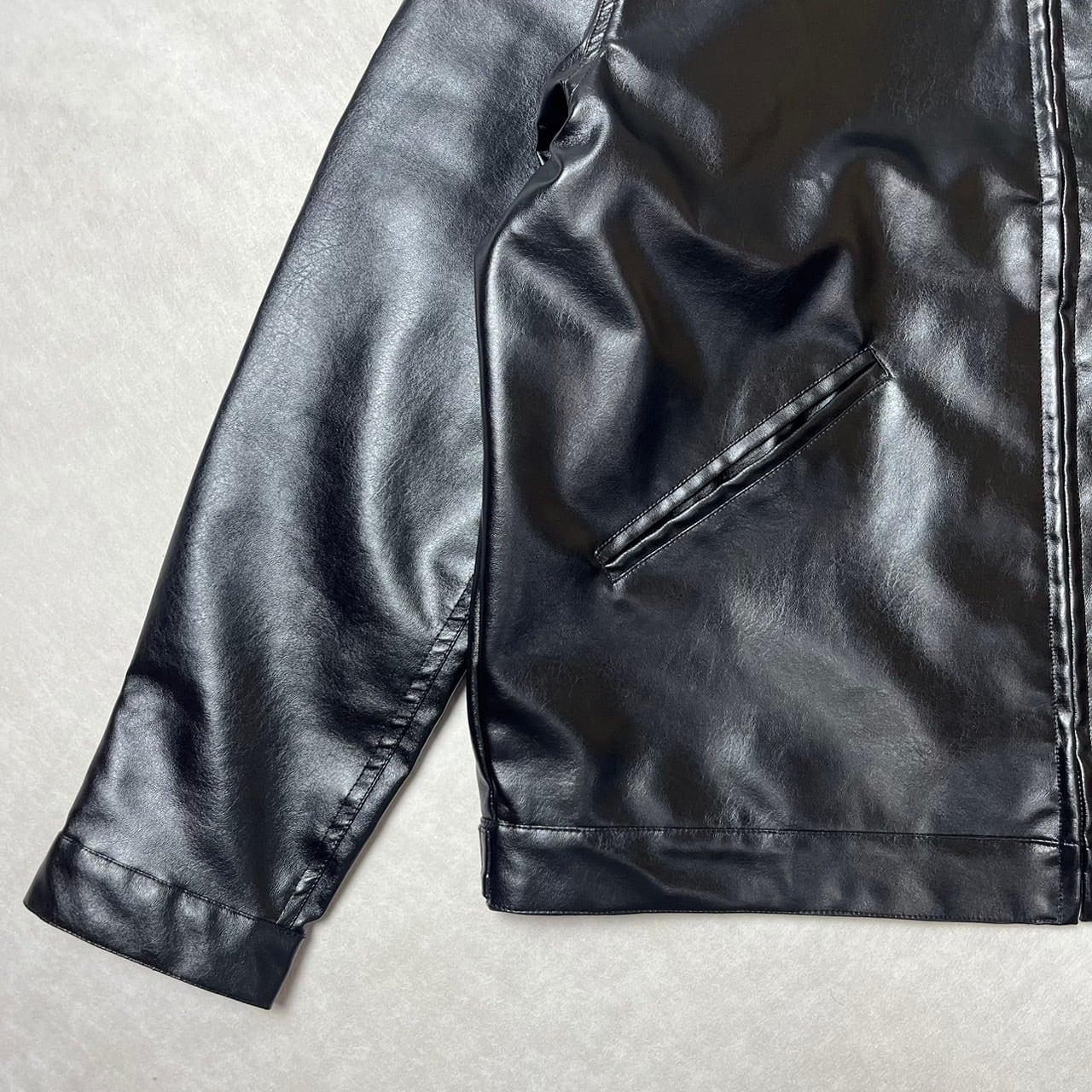 しなやかな光沢を放つフェイクレザーを採用し、本革さながらの質感と上品な高級感を実現しました。ヴィンテージのデトロイトジャケットをベースに、現代的なシルエットとスマートなディテールへとアップデート。無駄のないシンプルなデザインながら、存在感のある佇まいがスタイリングを格上げします。