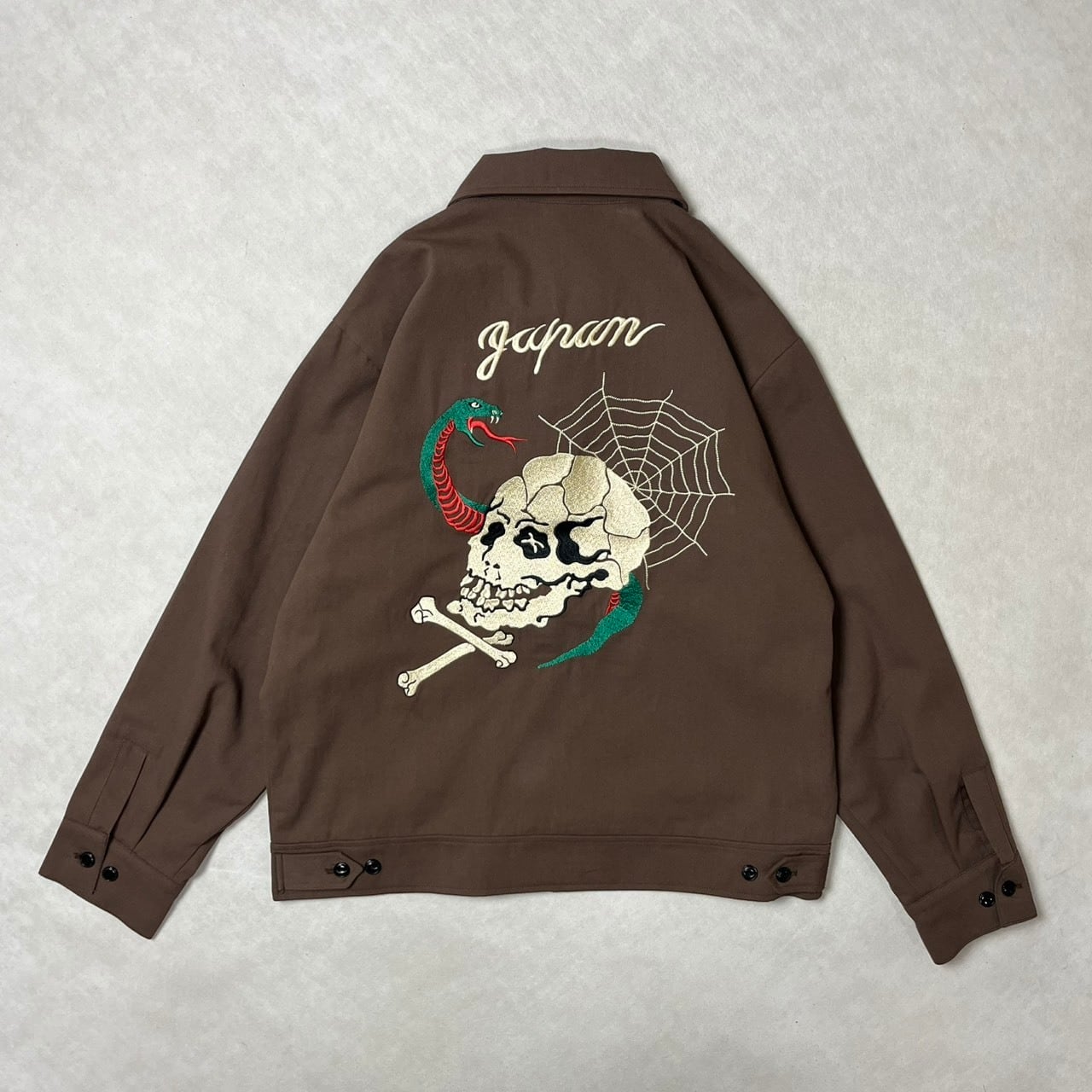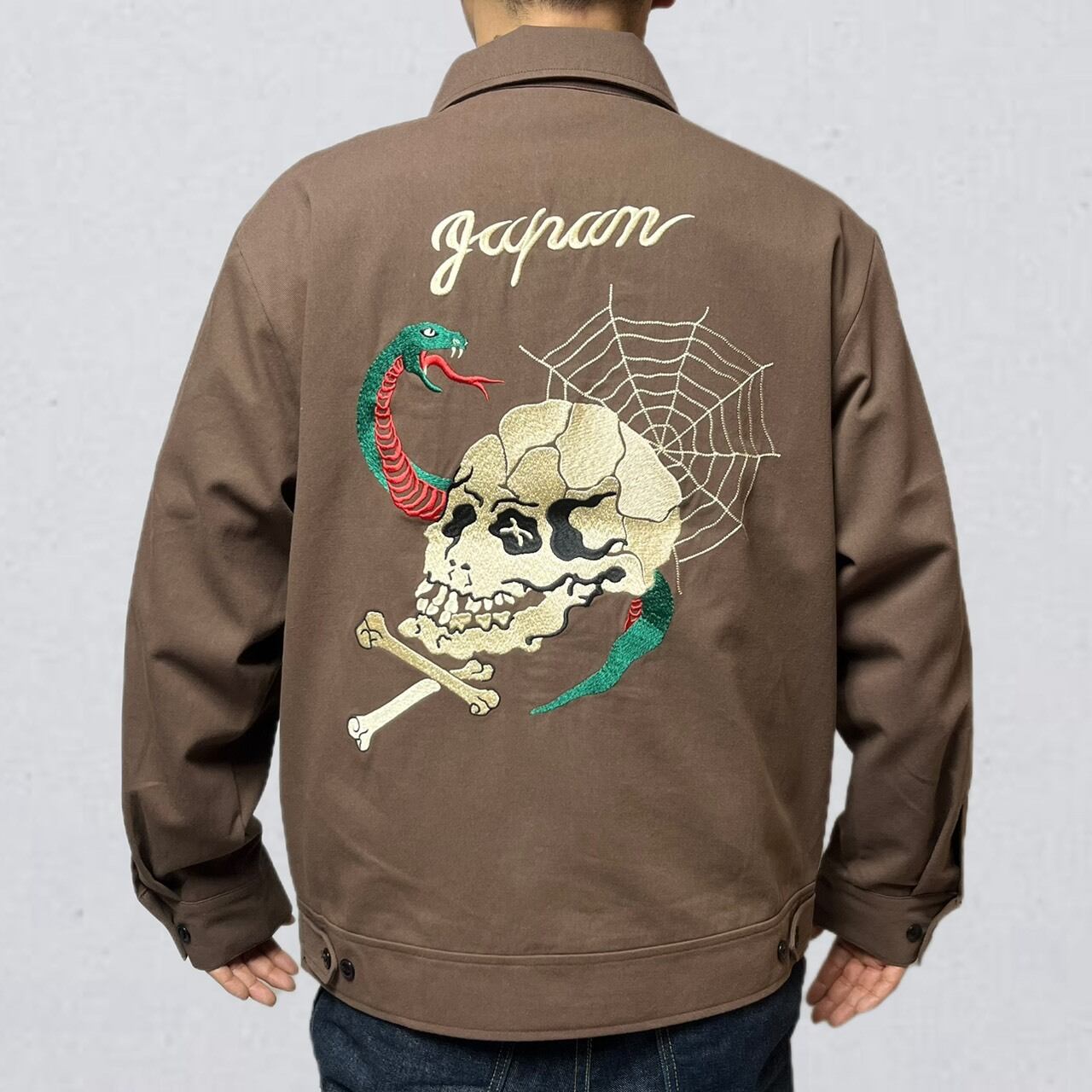 背面にはスカル×スネーク×スパイダーウェブを組み合わせた存在感のある刺繍を大胆に配置。立体感のある刺繍表現で、後ろ姿まで抜かりなく仕上げています。