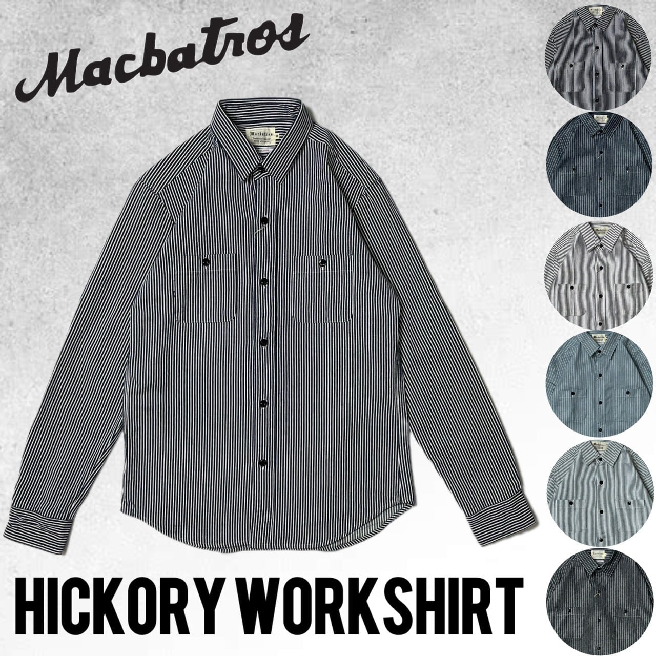 ワークウェアの定番、ヒッコリーストライプ生地を使用した国産定番シリーズです。